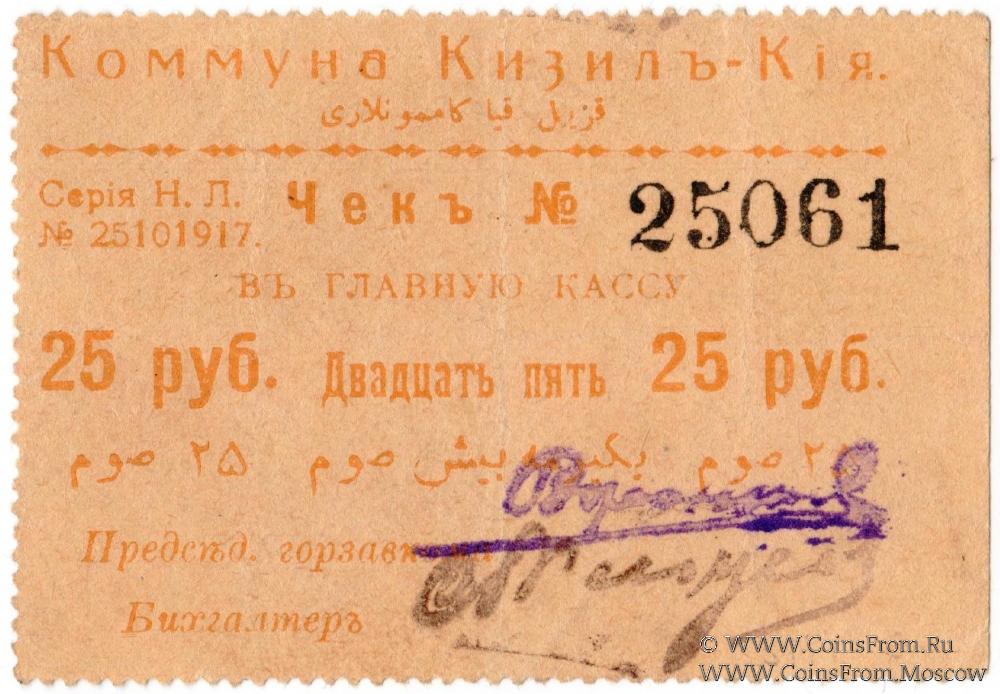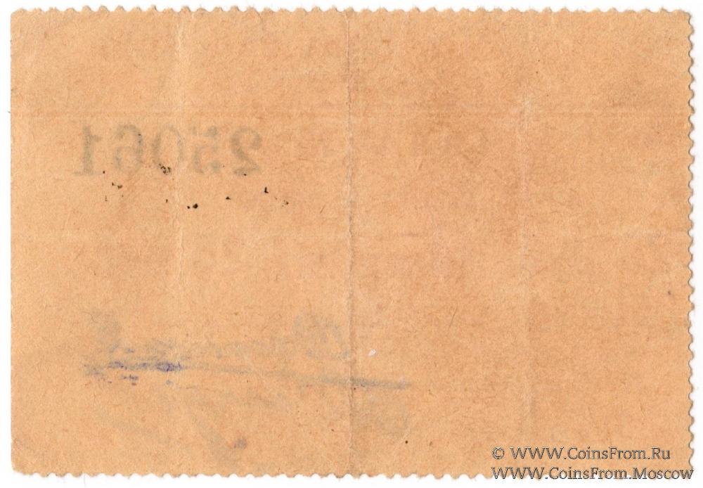 Чек в главную кассу. Номер 5-значный. С зубцами (с трех сторон), без печати, шрифт красно-оранжевый, подписи факсимиле. Коммуна Кизил-Кия.
