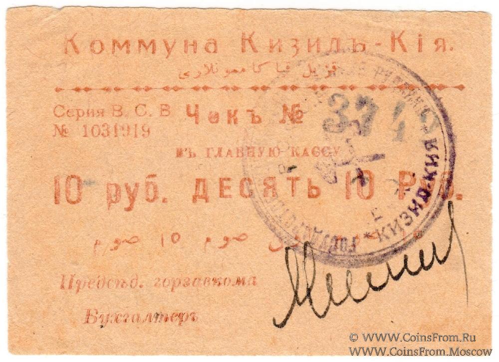 Чек в главную кассу. Без зубцов. С печатью, шрифт коричневый, подписи от руки. Номер 4-значный. Коммуна Кизил-Кия.