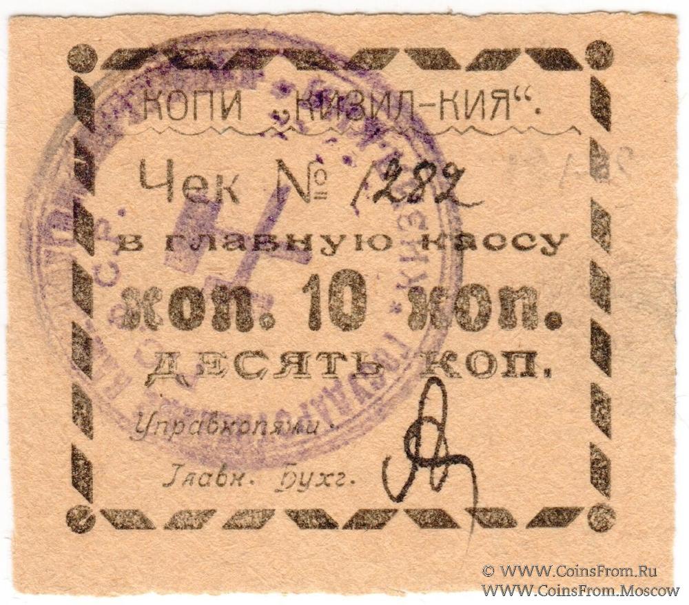 Чек в главную кассу без даты (1918 г.). Номер и подписи от руки. Печать фиолетовая. КОПИ "Кизил-Кия" (Управление).