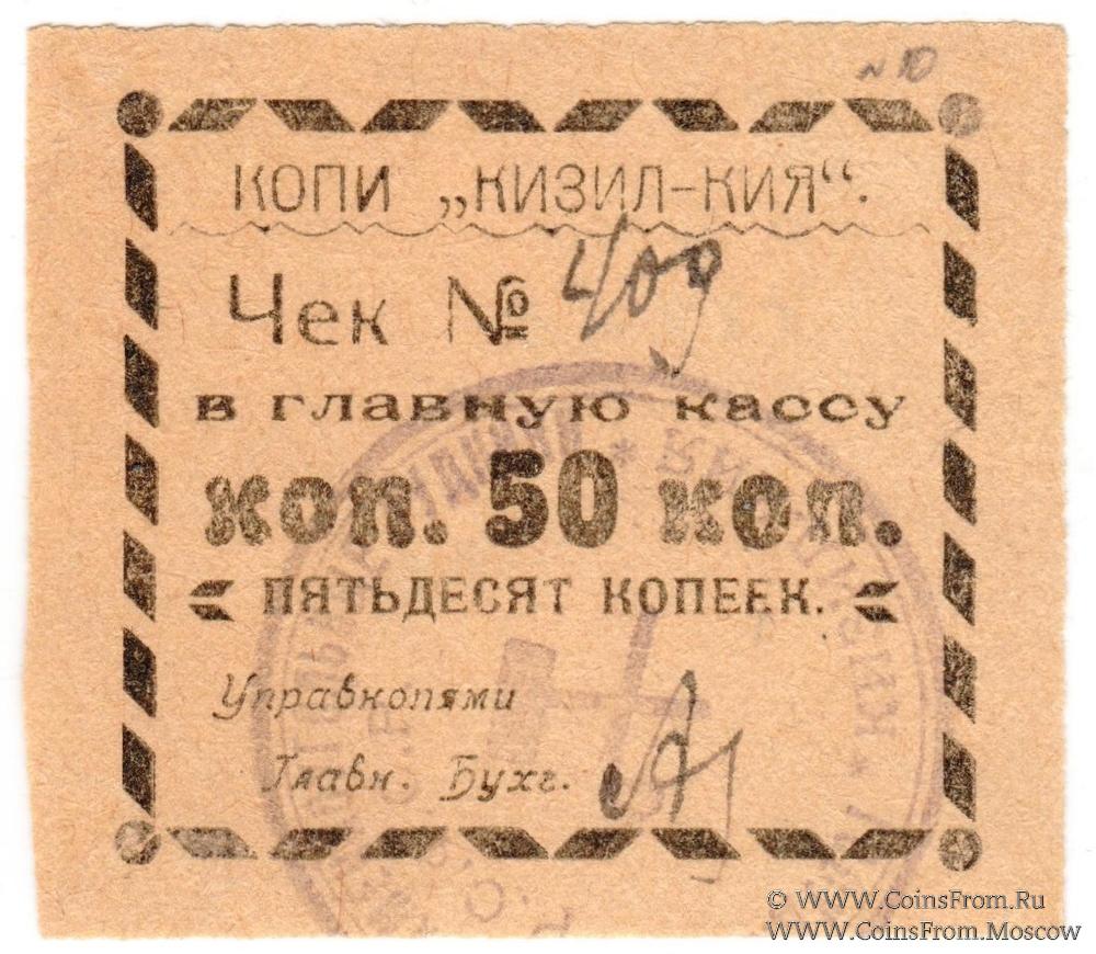 Чек в главную кассу без даты (1918 г.). Номер и подписи от руки. Печать фиолетовая. КОПИ "Кизил-Кия" (Управление).