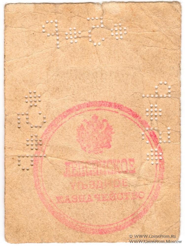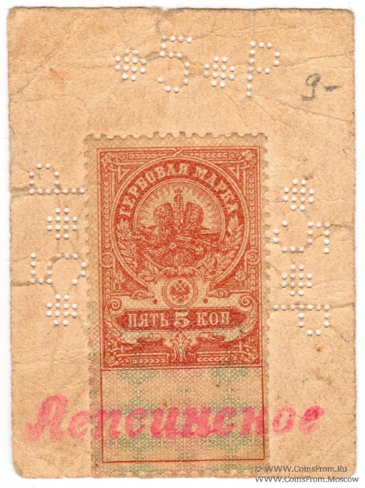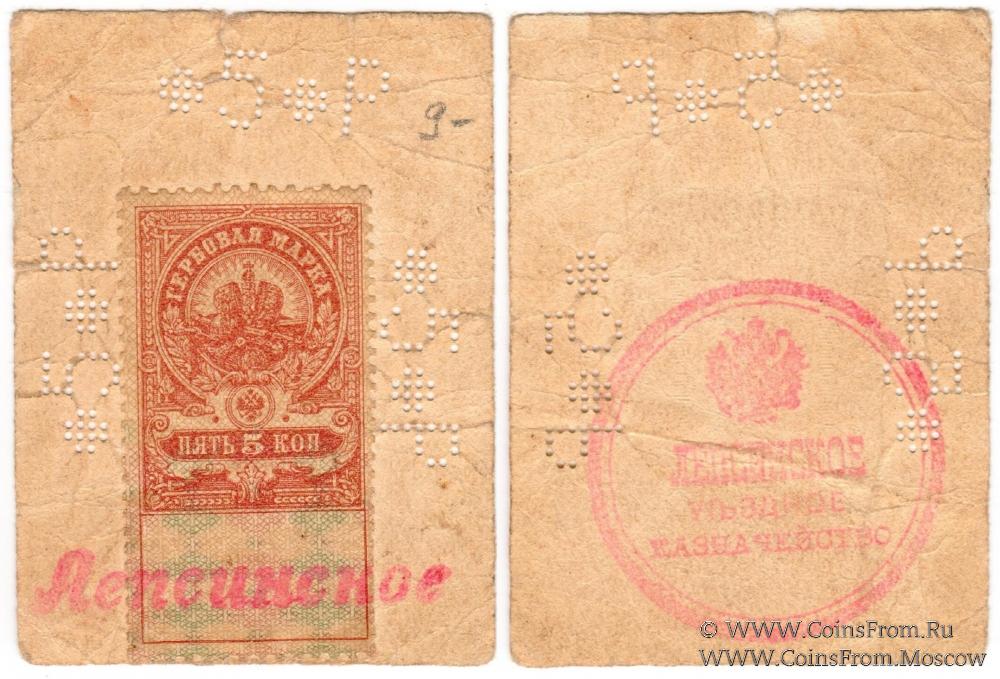 Марка на бумаге с надпечаткой красного цвета "Лепсинское". На реверсе печать с малым орлом. Лепсинское Уездное Казначейство.