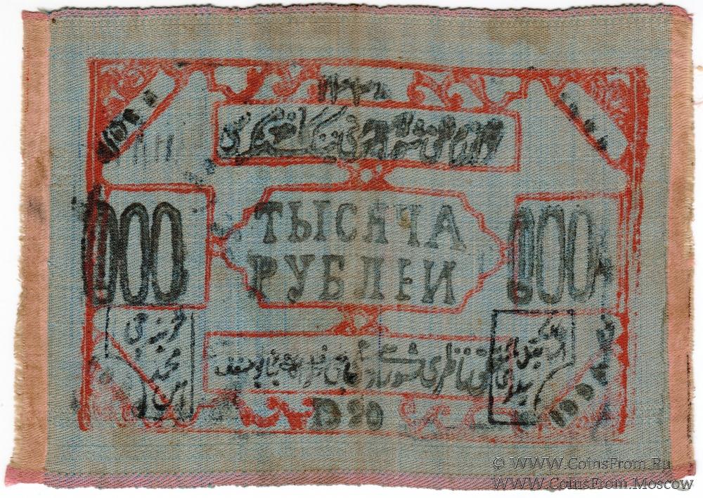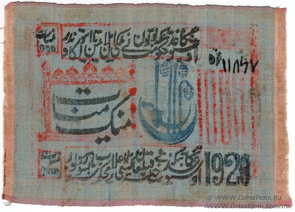 Выпуск 1920 г. (1338 / ١٣٣٨) на шёлке. Фон голубой. Печати-подписи в фигурных рамках - председатель Совета Народных Назиров (заведующий банком).