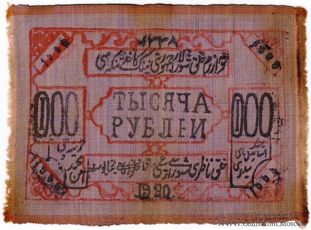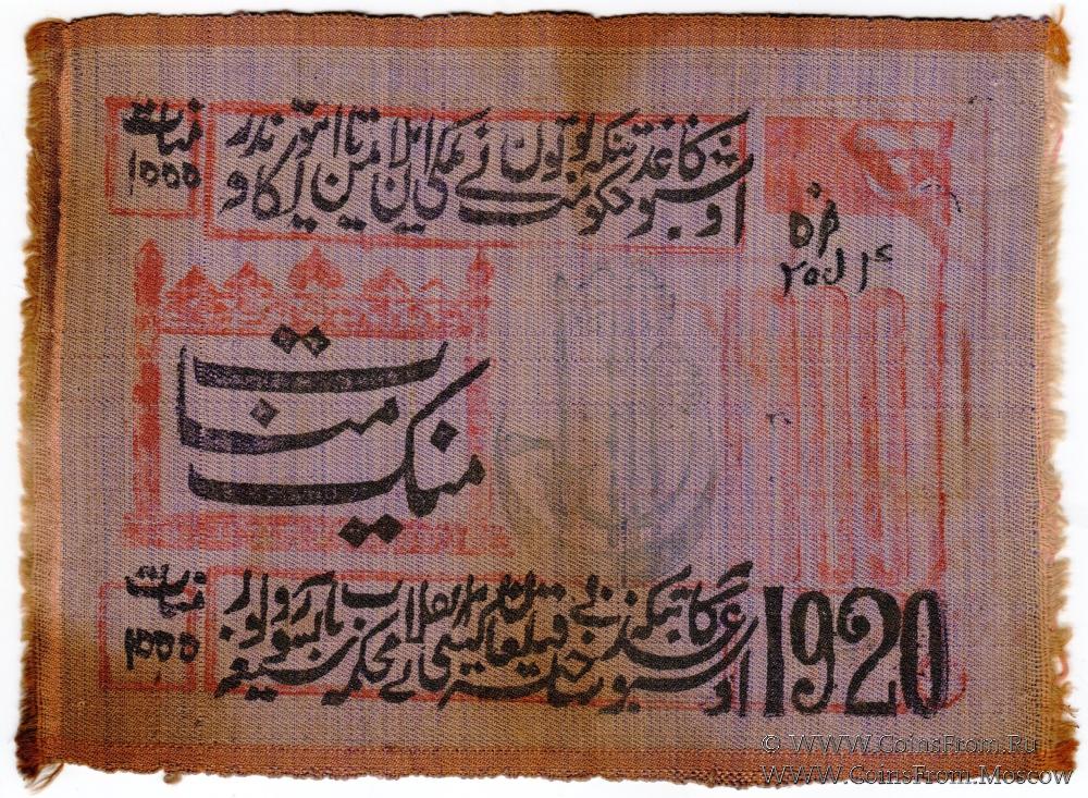 Выпуск 1920 г. (1338 / ١٣٣٨) на шёлке. Фон фиолетовый. Печати-подписи в фигурных рамках - председатель Совета Народных Назиров (заведующий банком).
