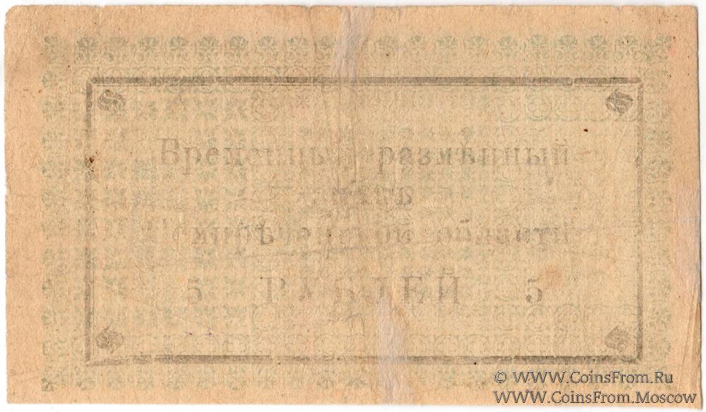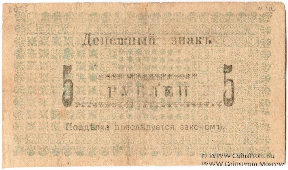 Денежный знак без даты (1918 г.). Край фона кружева. "5" - украшенная. Текст черный. Временный разменный знак Семиреченской области 5 рублей.
