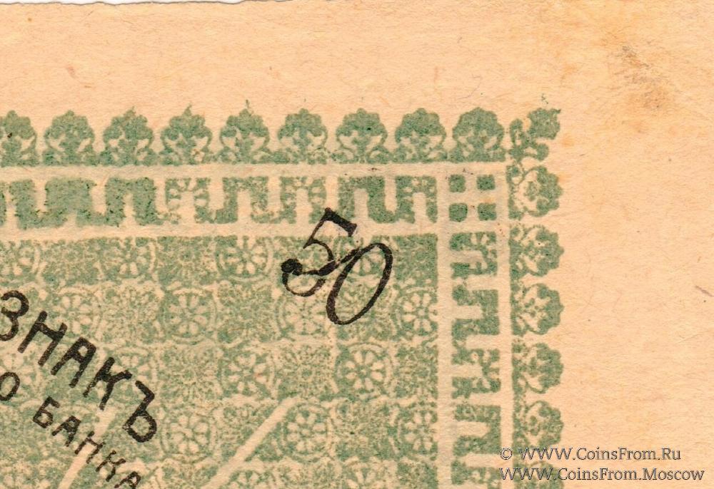 БРАК печати: залип краски на номинале "50" в верхнем правом углу на аверсе, фон реверса сдвинут вправо. Сетка фона зеленая.