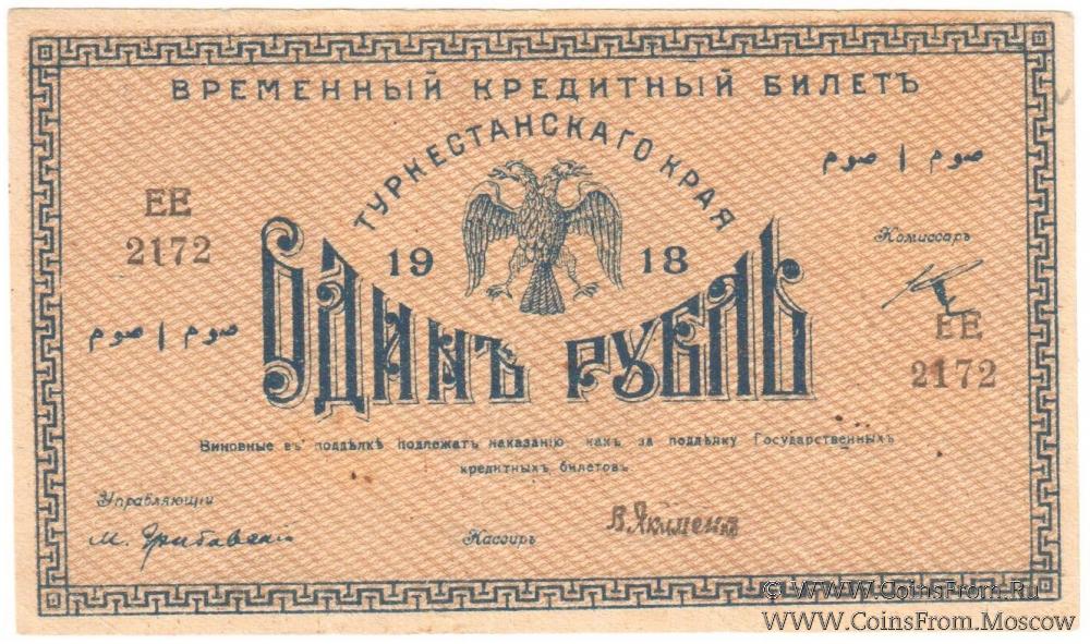 Временный Кредитный билет Туркестанского края 1918 г. Литера Е. Кассир - Якименко.