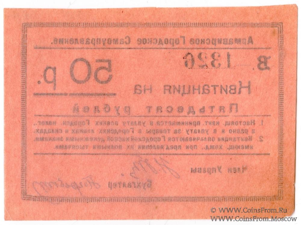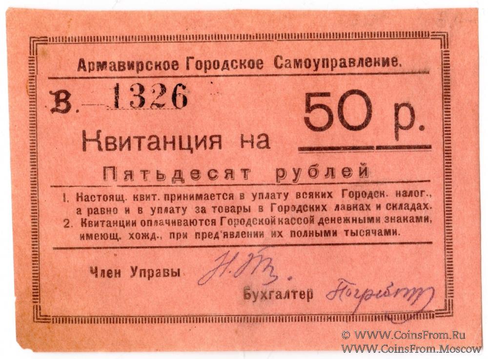 Квитанция 1919 г. Подписи рукописные. Армавирское Городское Самоуправление.
