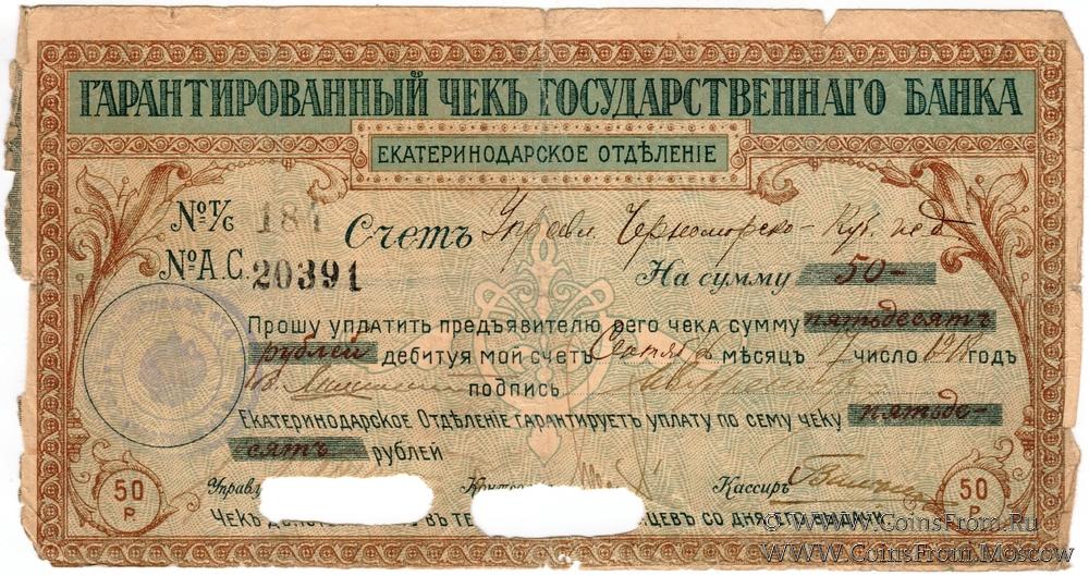 Печать: малый орел, текст: "Екатеринодар.отд. * Государственный Банкъ *".
