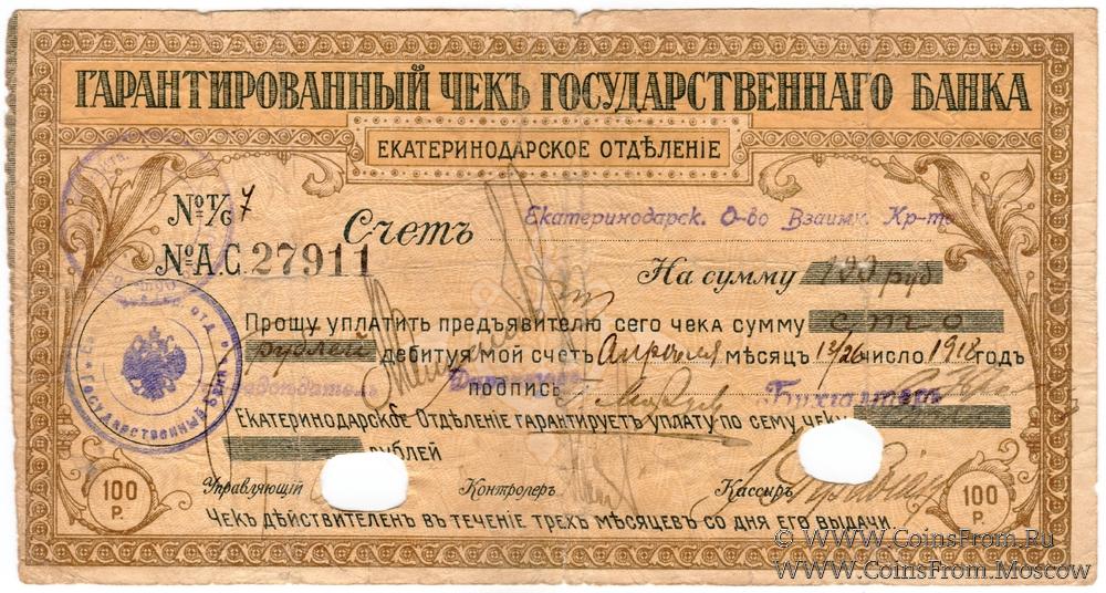 Печать: малый орел, текст: "Екатеринодар.отд. * Государственный Банкъ *".