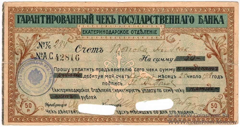 Печать: малый орел, текст: "Екатеринодар.отд. * Государственный Банкъ *".