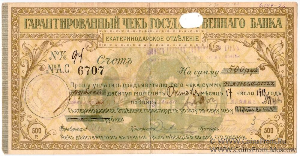 Чек на 500 рублей 1918 г. (Екатеринодар)