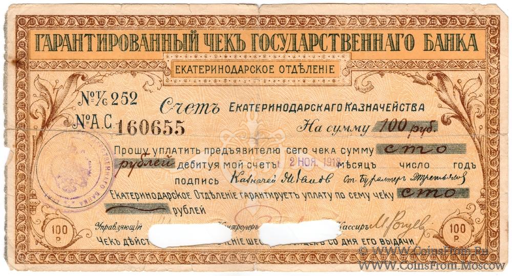 Печать: большой орел, текст: «Екатеринодарское отдъл. Государственнаго Банка».