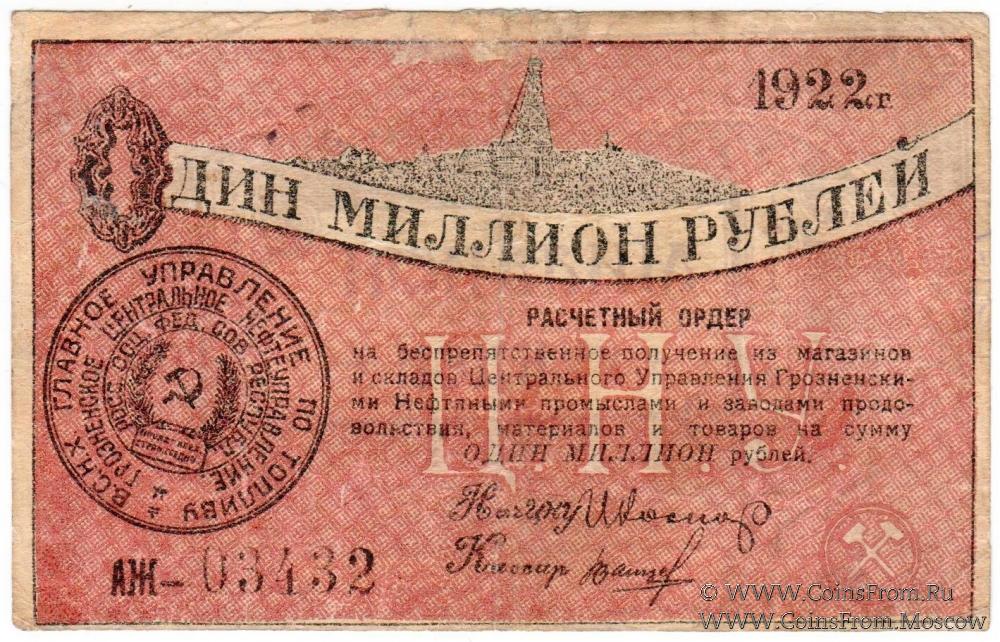 Расчетный ордер 1922 г. В.С.Н.Х. Главного управления по топливу. Грозненское центральное нефтяное управление. Грознефть.