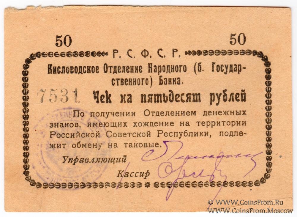 Чек (1919). "Р.С.Ф.С.Р." вместо орла. Номер 4-значный. Кисловодское Отделение Народного (б. Государственного) Банка.