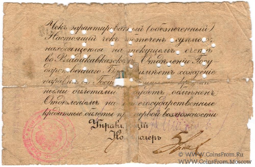 Чек. Синий, рамка без текста. Счет Комиссариата… Погашен перфорацией "14 ГБ". Владикавказское Отделение Государственного Банка.