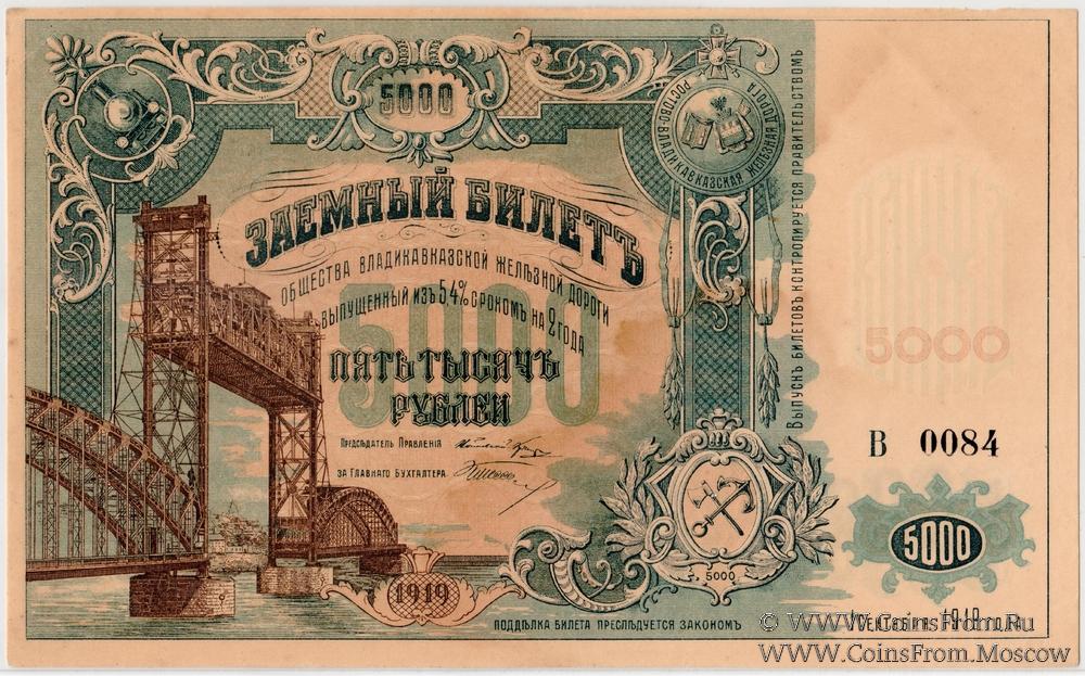 Заемный билет. Выпуск 1919 г. Серия В. Номер 4-значный. Типография: Экспедиция при Ростовской КГБ.