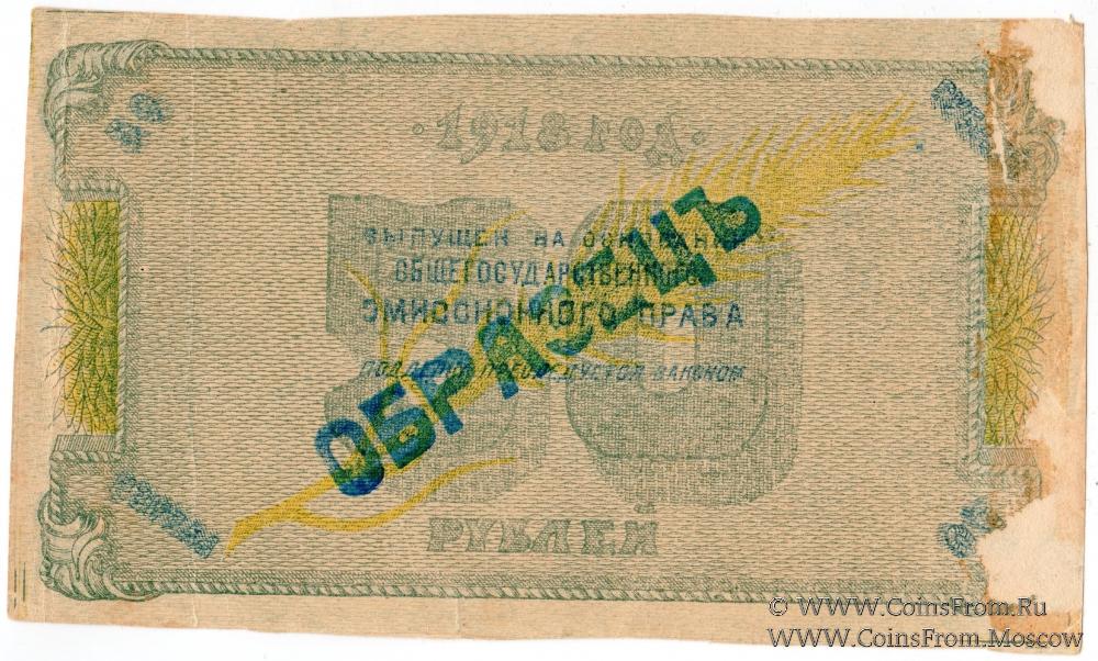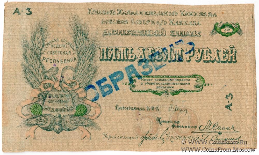 Денежный знак 1918 г. Серия А. Штамп "ОБРАЗЕЦ" по диагонали на аверсе и реверсе. Краевой Исполнительный Комитет Советов Северного Кавказа.