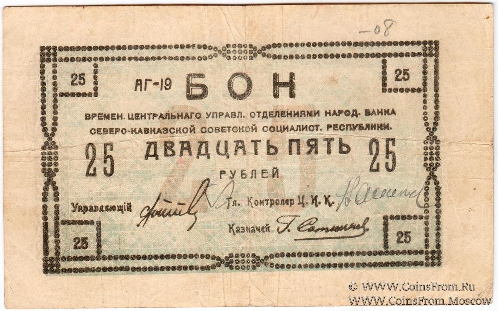 Бон 1918 г. Голубой фон на аверсе. Бумага жёлтая. Две литеры в серии. Временное Центральное Управление Отделениями Народного Банка.