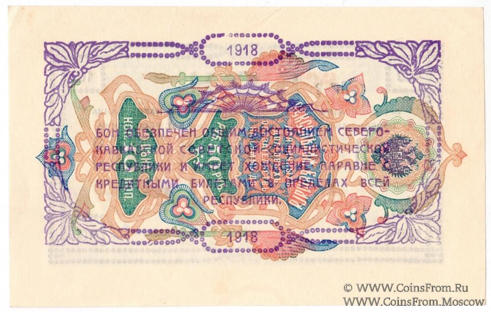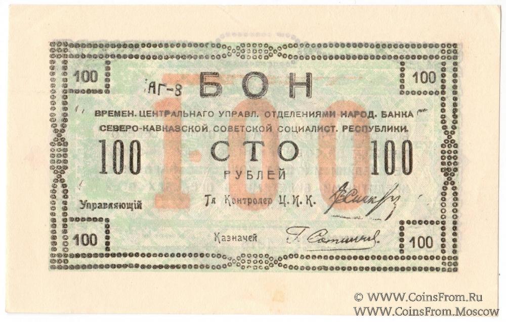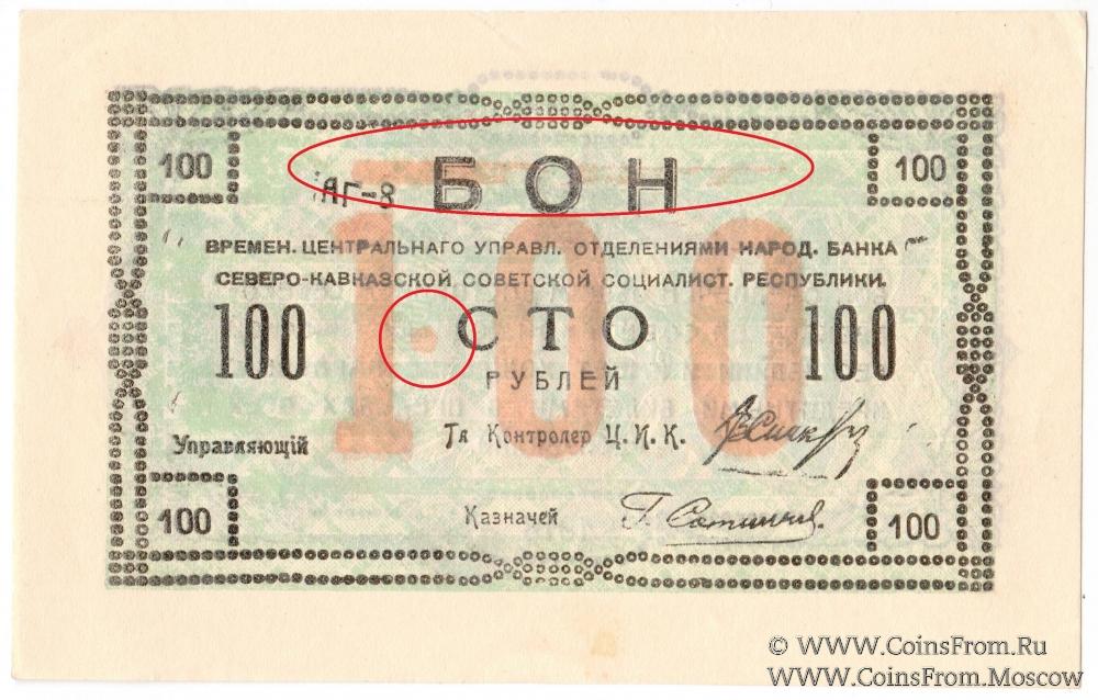 Бон 1918 г. БРАК: элементы краски над цифрой "100", точка между "1" и "0". Без подписи управляющего. Фон зеленый на аверсе. Бумага белая. Элементы водяного знака.
