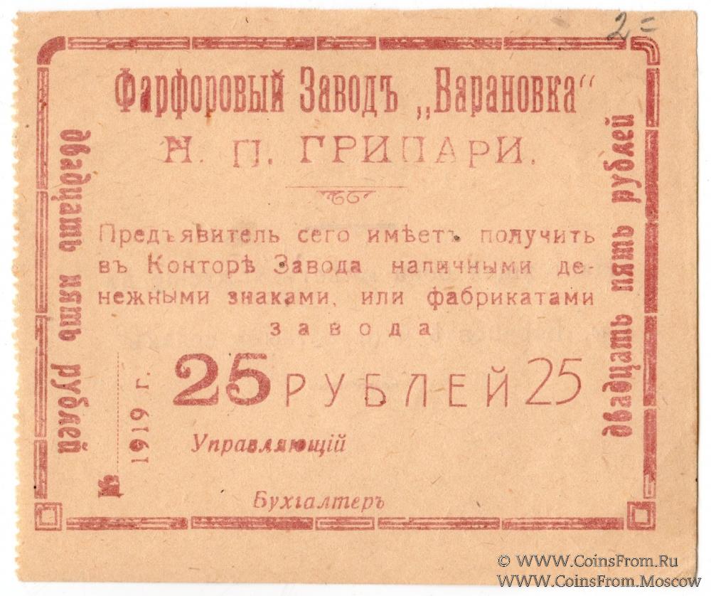 Бон. Бланк. Фарфоровый Завод "Барановка" Н.П. Грипари.