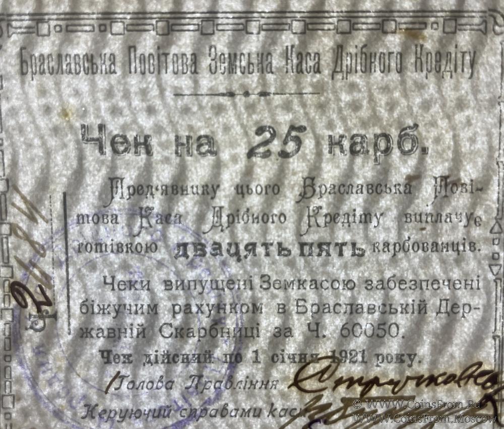 Чек 1919 г. Действителен до 1 января 1921 г. (Чек дiйсний по 1 сiчня 1921 року).