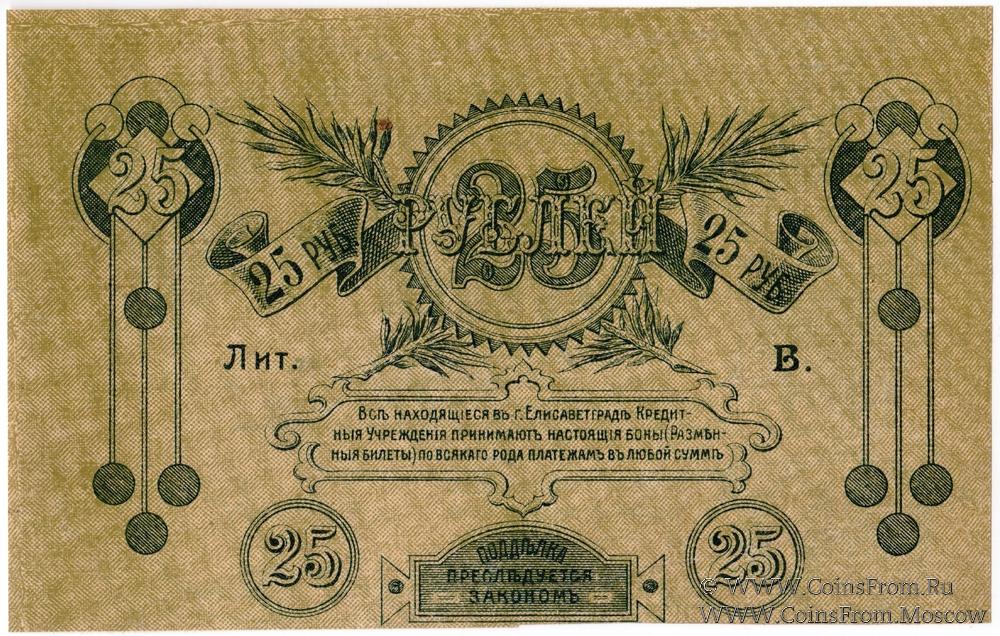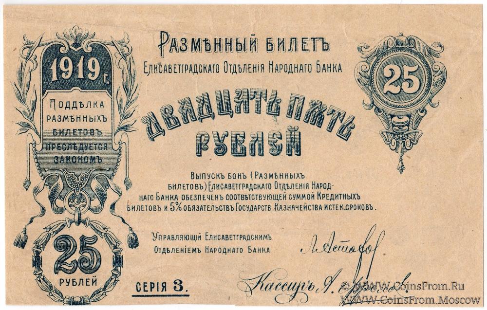 Разменный билет 1919 г. БРАК печати: без фона на аверсе. Cерия 3 (аверс), литера В (реверс). Без номера. Елизаветградское Отделение Народного Банка.