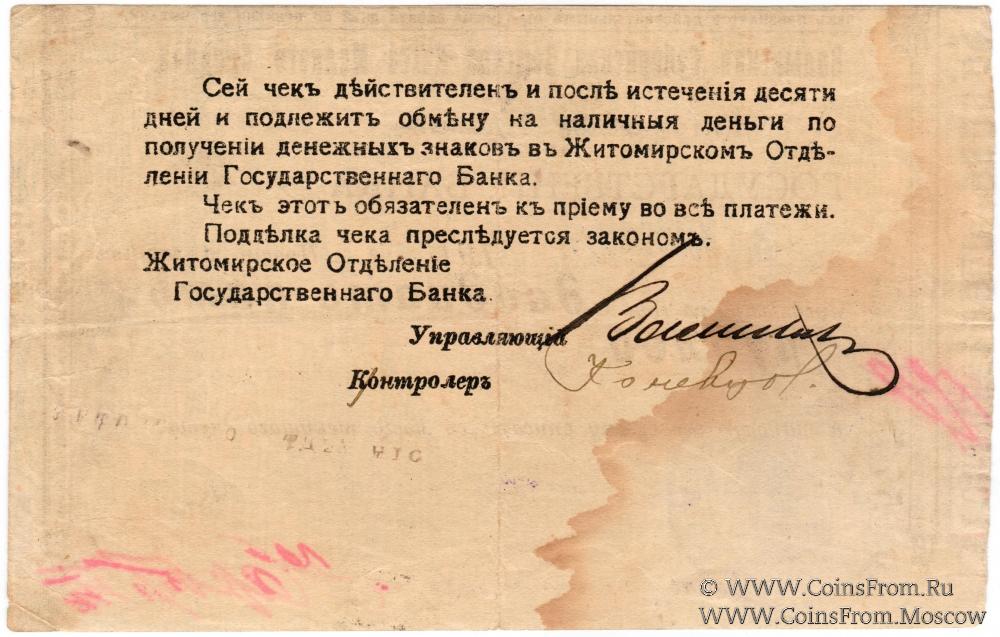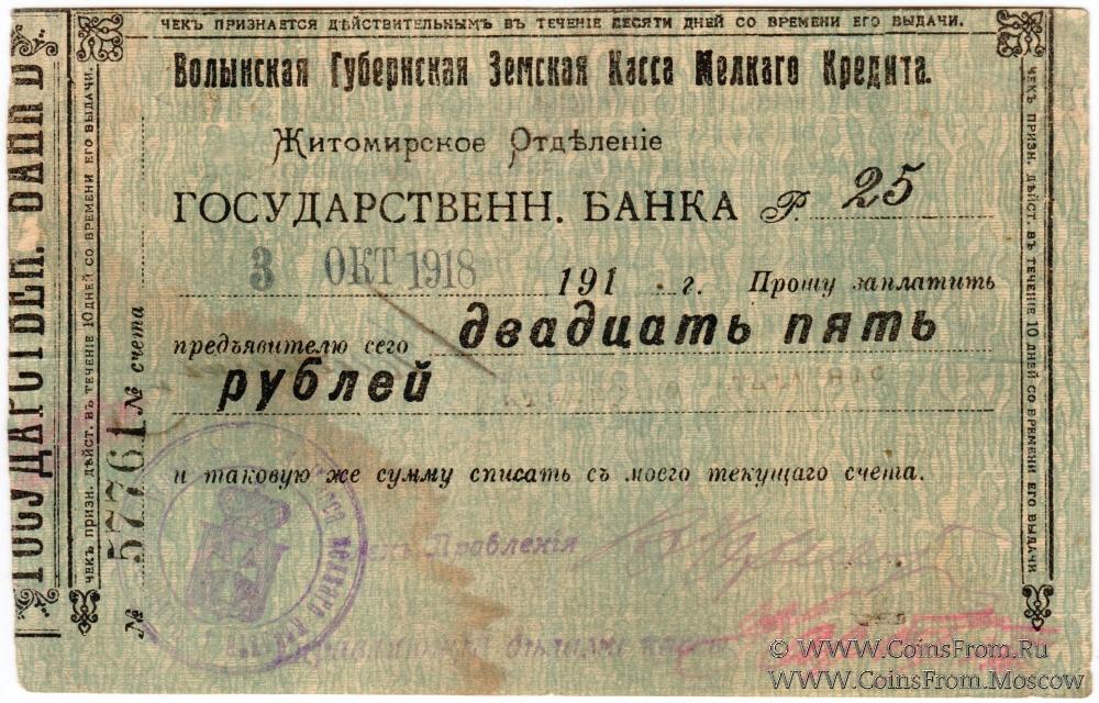 Чек 1918 г. Дата (03.10.1918) штампом. Печать вариант 1 (щит с короной; земская касса). Без водяных знаков. Волынская Губернская Земская Касса Мелкого Кредита. Житомирское отделение. Государственный Банк.