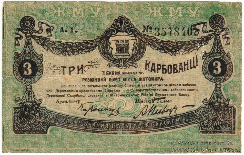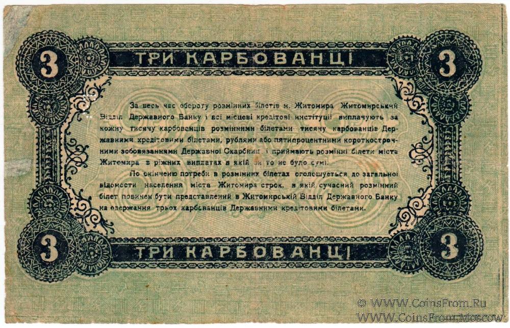 Разменный билет (Розмiнний бiлет) 1918 г. Желтоватый фон, перфорация цифры "3" отличается. Номер 6-значный. Городское самоуправление.