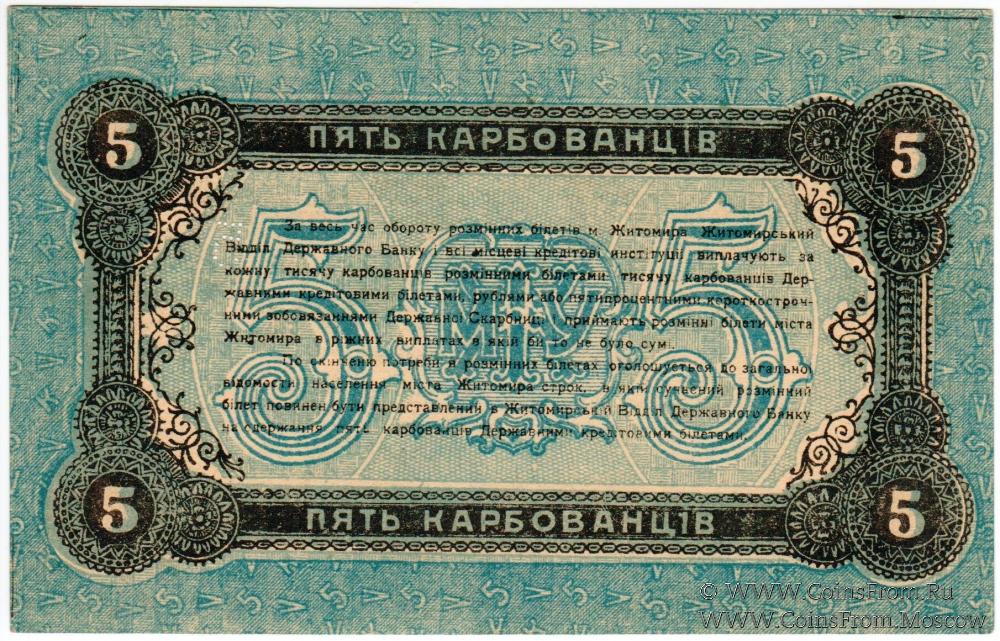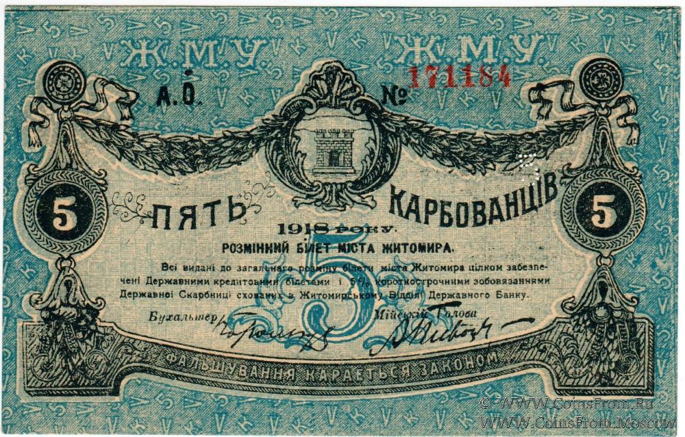Разменный билет (Розмiнний бiлет) 1918 г. Номер 6-значный красный 5 мм. Городское самоуправление.