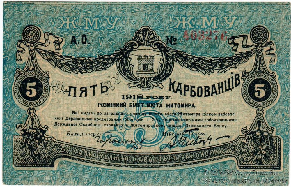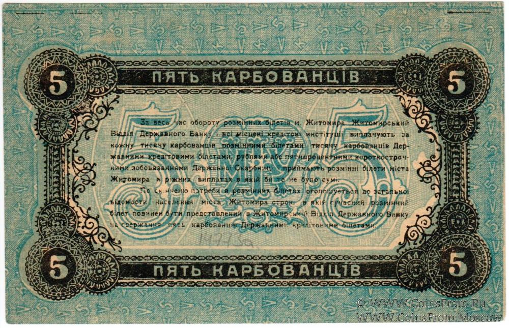 Разменный билет (Розмiнний бiлет) 1918 г. Номер 6-значный красный 5,5 мм, перфорация цифры "5" отличается. Городское самоуправление.
