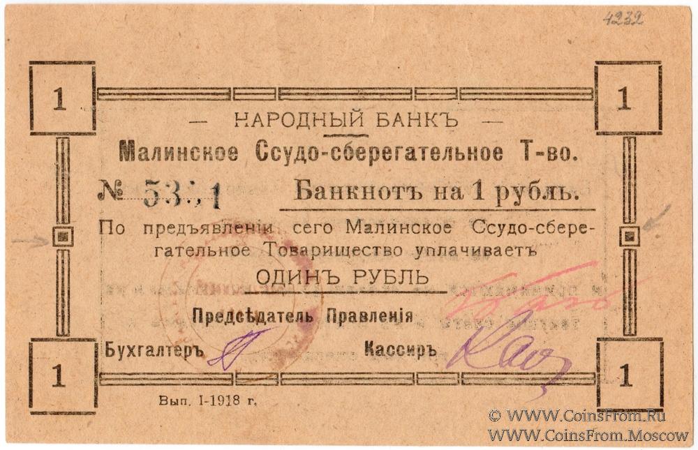 Банкнотъ 1918 г. Выпуск 1. Рамка - вариант 1. Варианты подписей и печати. Малинское Ссудо-сберегательное Товарищество. Народный Банк.