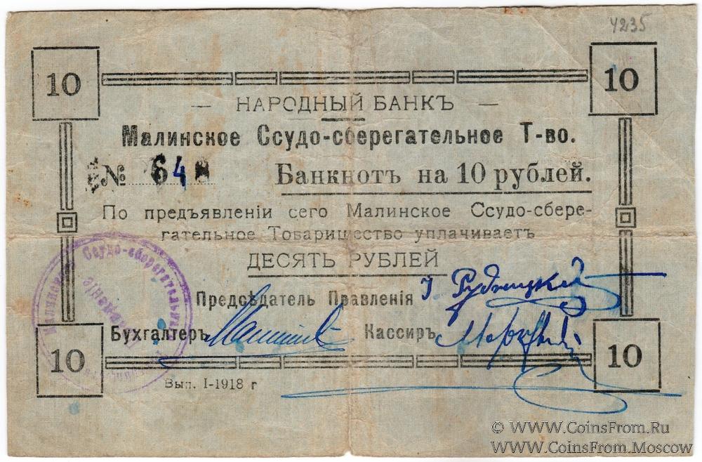 Банкнотъ 1918 г. Выпуск 1. Рамка - вариант 3. Малинское Ссудо-сберегательное Товарищество. Народный Банк.