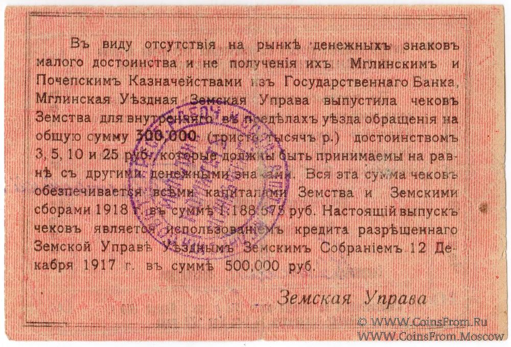 На реверсе печать: «ИСПОЛНИТ. КОМИТЕТЪ МГЛИНЪ ЧЕРН. Г.» (в центре) / «МГЛИНСКİЙ СОВЪТЪ КРЕСТ. РАБОЧ. И СОЛД. ДЕПУТ.» (по кругу).