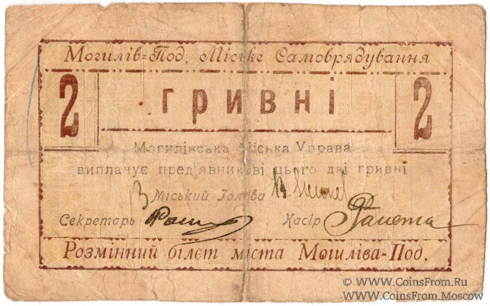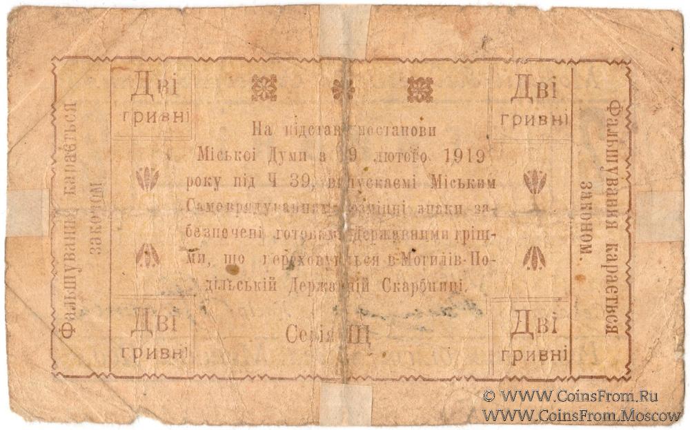 Разменный билет (Розмiнний бiлет). Выпуск 19.02.1919 г. Серия Щ. Городское Самоуправление (Miське Самоврядування).
