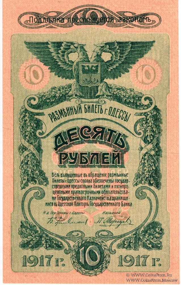 Разменный билет г. Одессы 1917 г. Серия и номер синие на реверсе. Городское Самоуправление.
