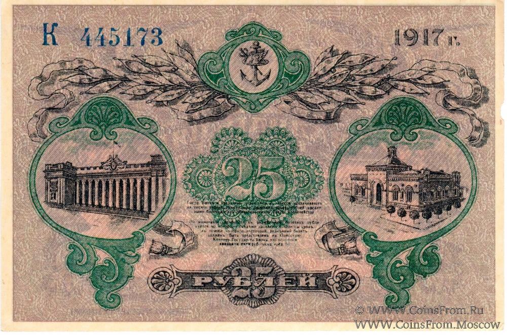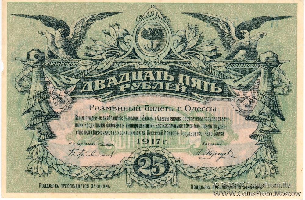 Разменный билет г. Одессы 1917 г. Серия и номер синие на реверсе. Без водяного знака. Вход справа. Фон бледно-розовый. Городское Самоуправление.