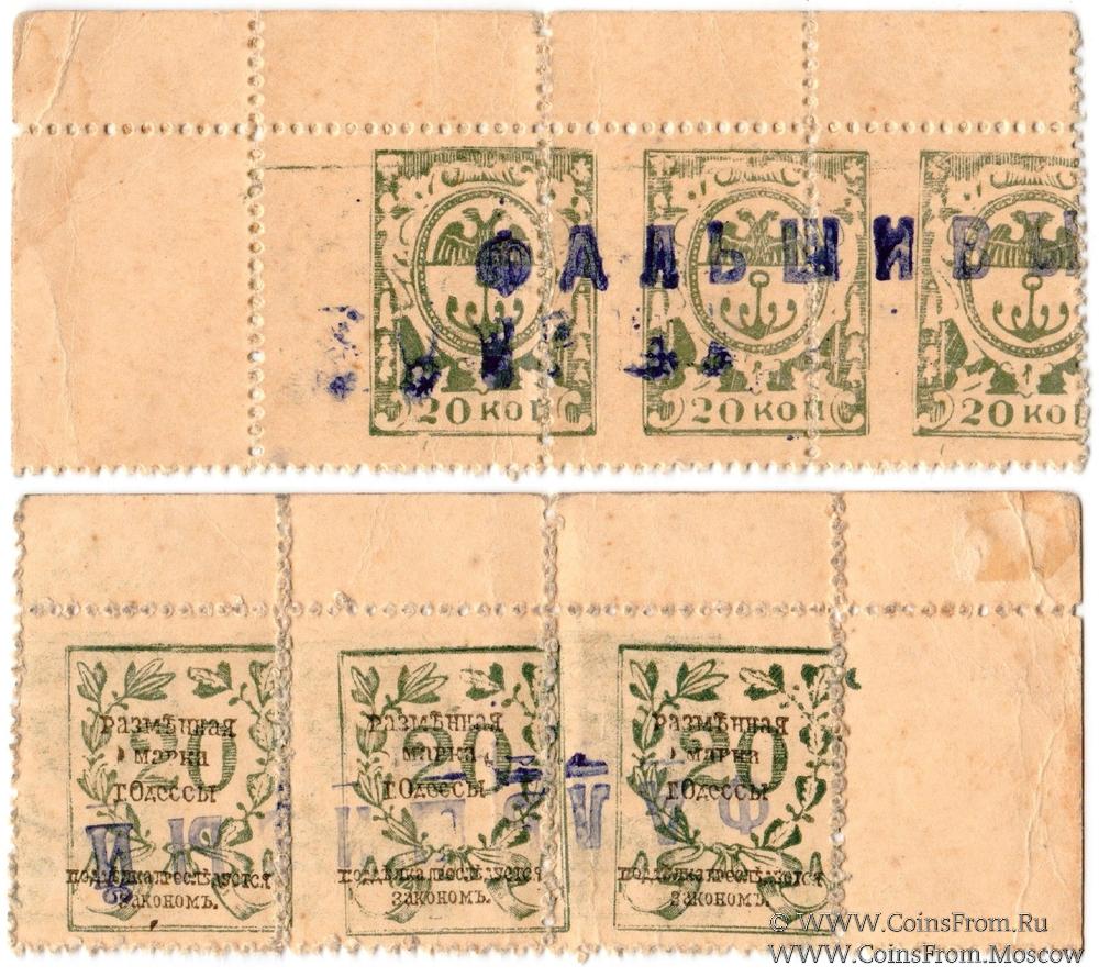 Разменная марка г. Одессы без даты (1917 г. ). Фальшивые. Сцепка из 3-х марок. Городское Самоуправление.