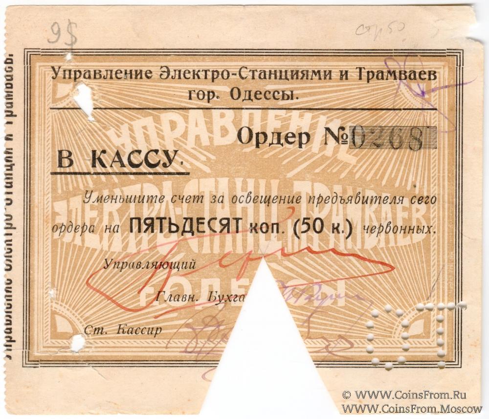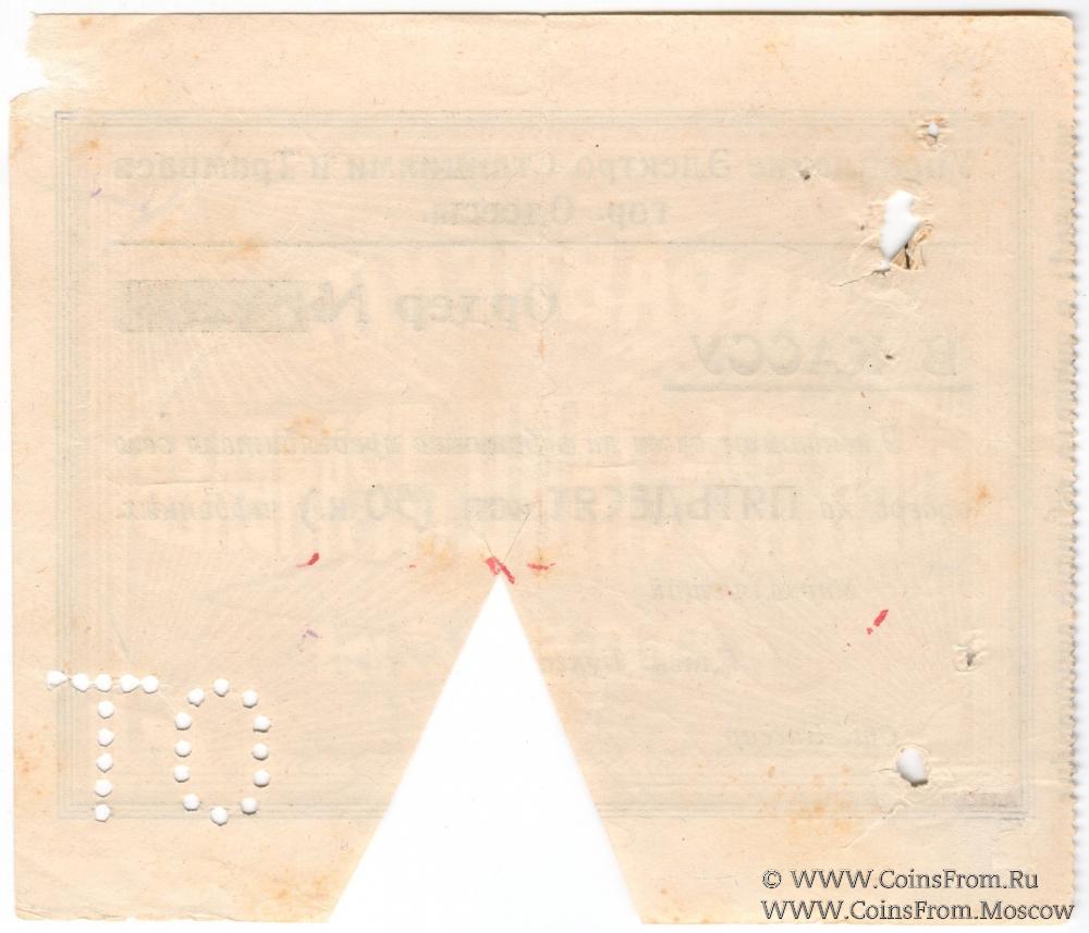 Ордер без даты (1923 г.) в червонном исчислении. Гашение. Перфорация "ОТ". Управление Электро-Станциями и Трамваев гор. Одессы.