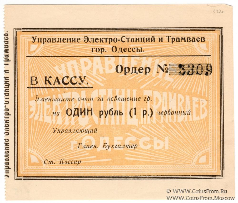 Ордер без даты (1923 г.) в червонном исчислении. Бланк. Управление Электро-Станциями и Трамваев гор. Одессы.