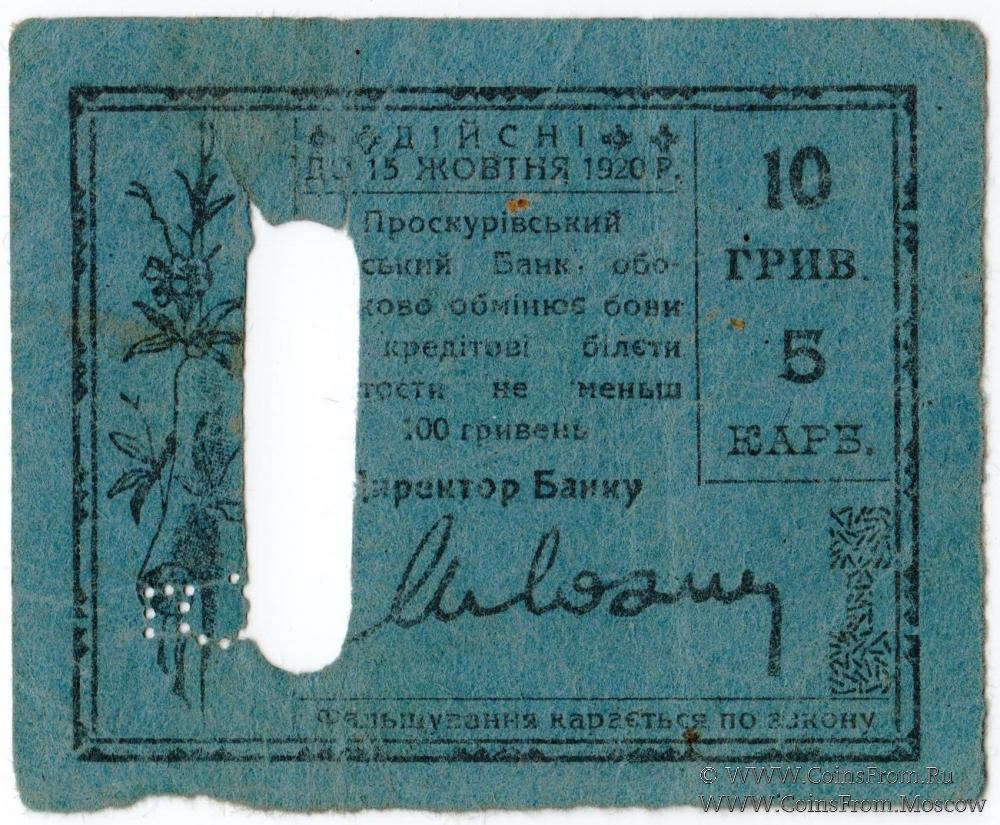 10 гривен (5 карбованцев) 1920 г. (Проскуров)