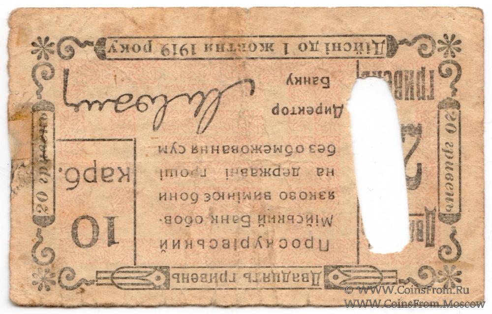 Бона (действительна до 01.10.1919 г.). Серия АГ. Гашение. Реверс перевернут. Проскуровский Городской Банк (Проскурiвський Мiйський Банк).