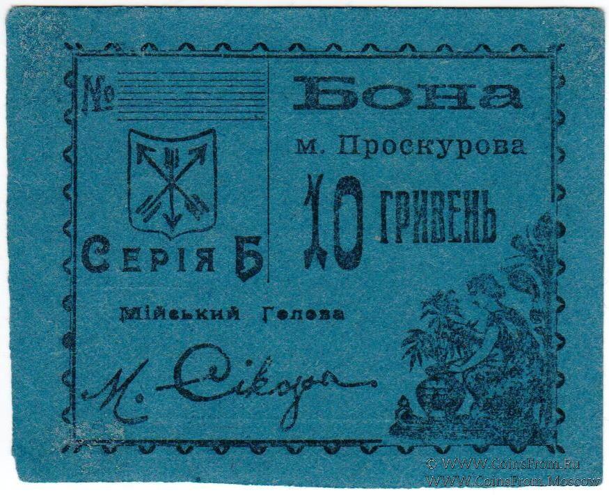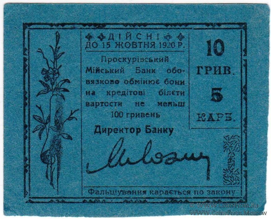 10 гривен (5 карбованцев) 1920 г. (Проскуров)