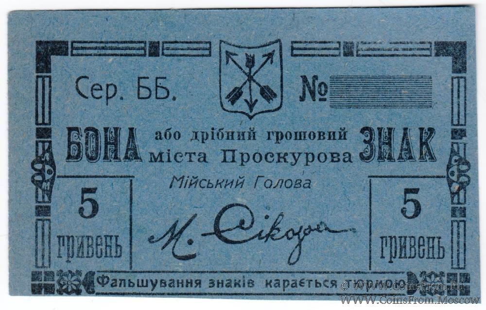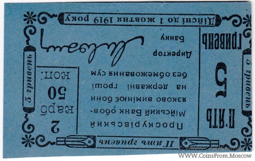5 гривен (2 карбованца 50 копеек) 1919 г. (Проскуров)