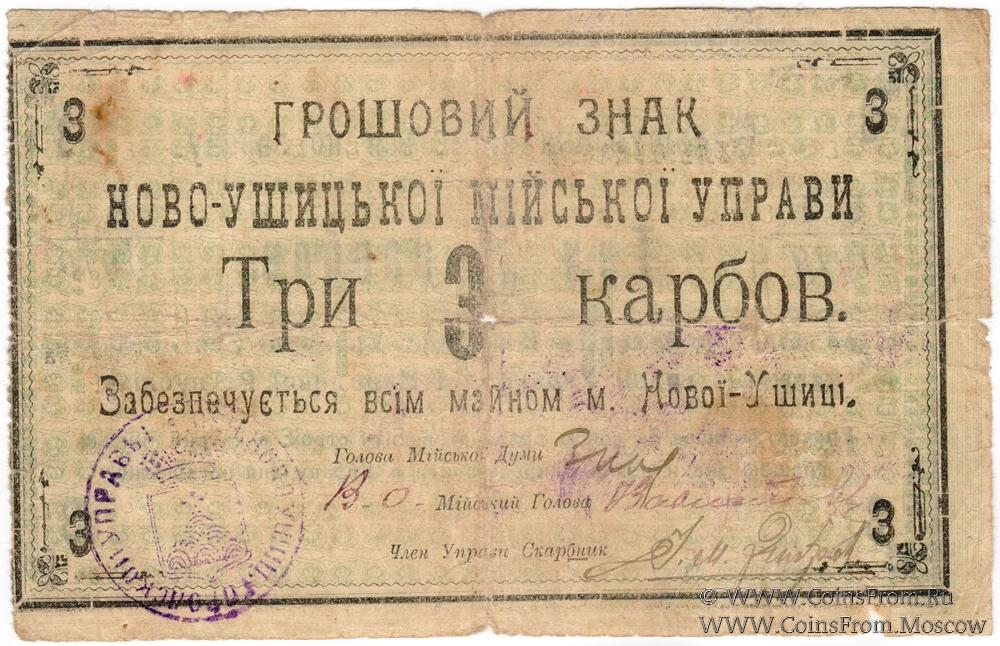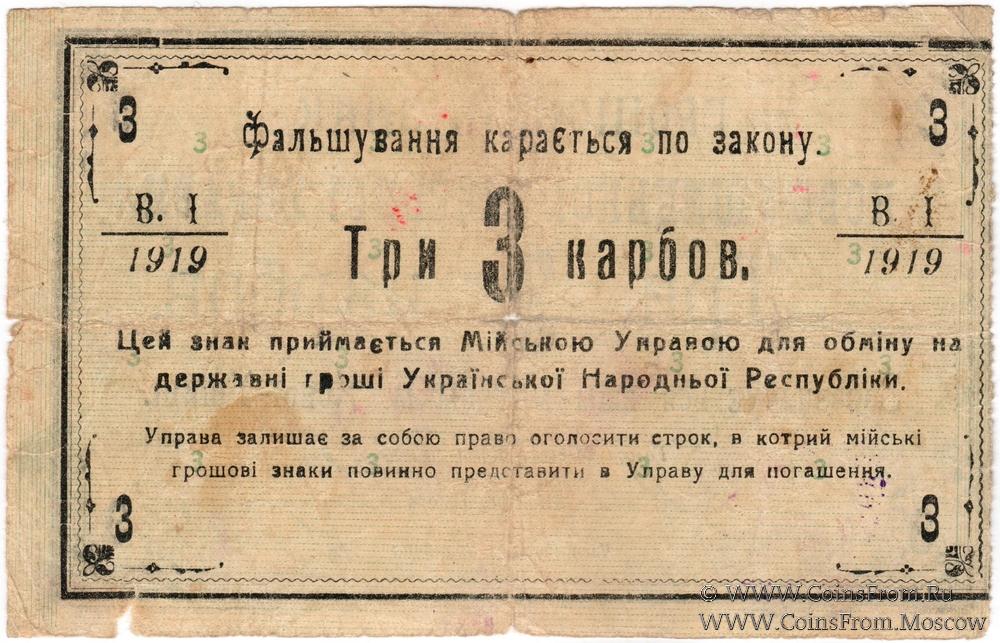 Денежный знак (Грошовій знак) 1919 г. Текст подписей Вариант 1: "Голова Мiйськоi Думи". Новоушицкая Городская управа.