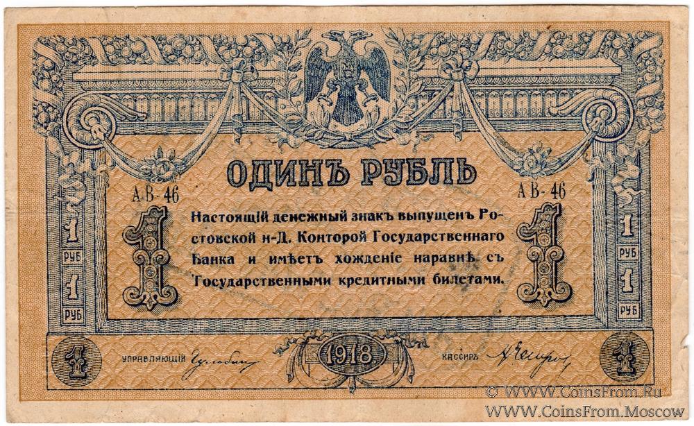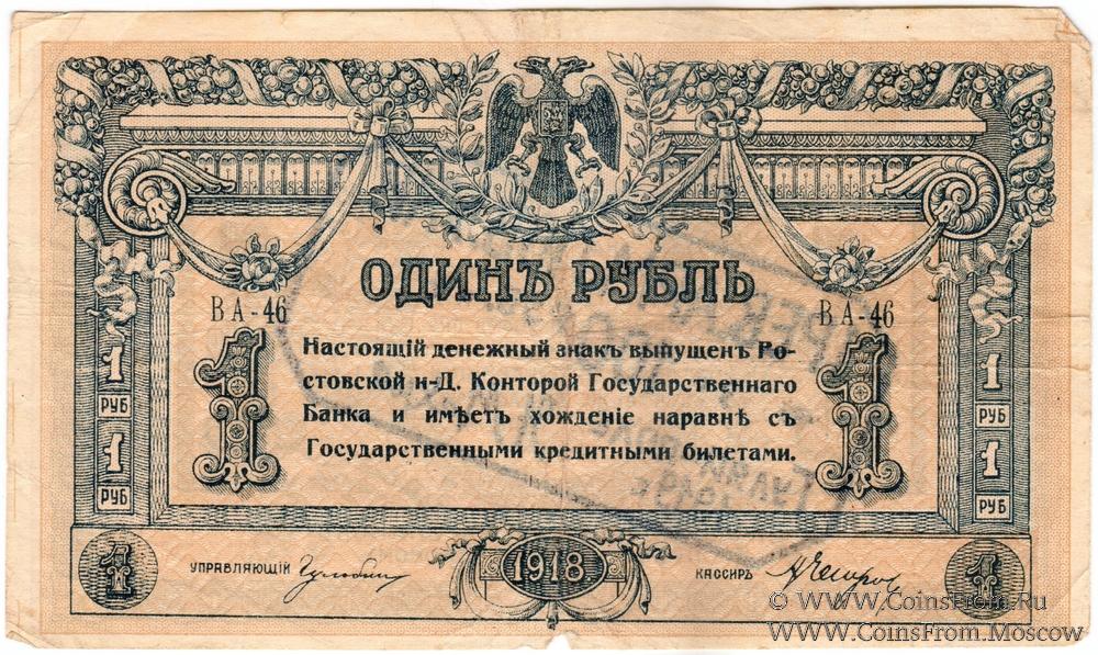Денежный знак 1 рубль 1918 г. Ростовской на Дону Конторы Государственного Банка с надпечаткой (штампом) на реверсе с обозначением нового номинала (100 рублей).