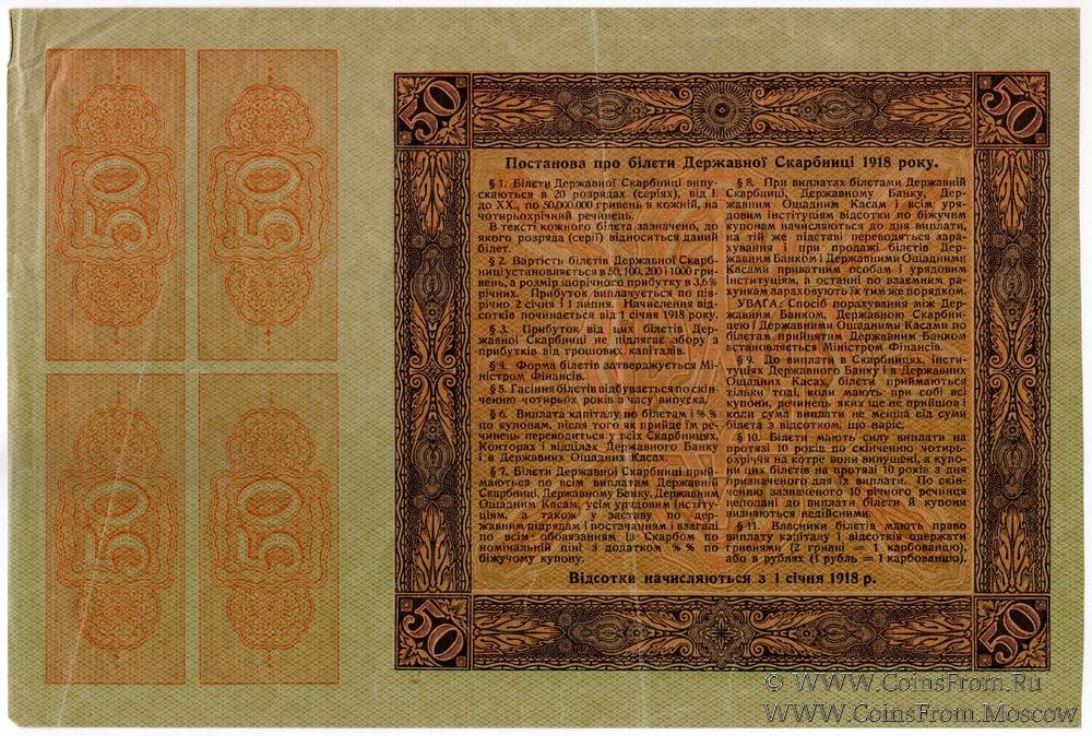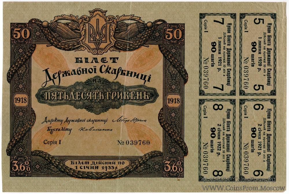 Выпуск 1. Серия I. 3,6% Билет Государственного Казначейства (Бiлет Державноi Скарбницi) 1918 г. с (4) купонами.