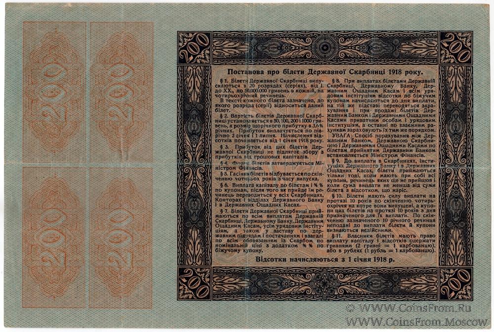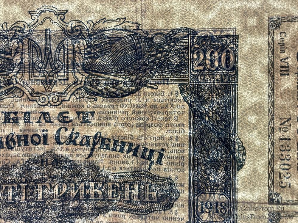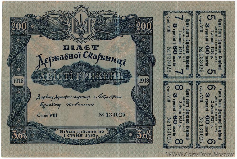 Выпуск 1. Серия VIII. 3,6% Билет Государственного Казначейства (Бiлет Державноi Скарбницi) 1918 г. с (4) купонами.
