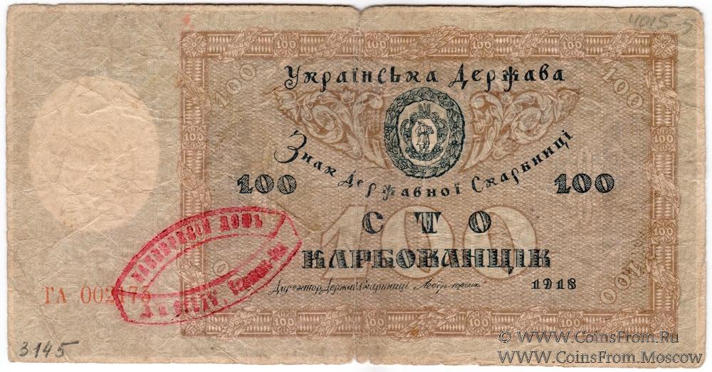 Серия ТА. Водяной знак - "связанные звезды". Штамп на аверсе красного цвета (неразборчиво). Каменецкая эмиссия (Каменецк-Подольская ЭЗГБ). Знак Государственного Казначейства (Знак Державної Скарбниці) 1918 г.