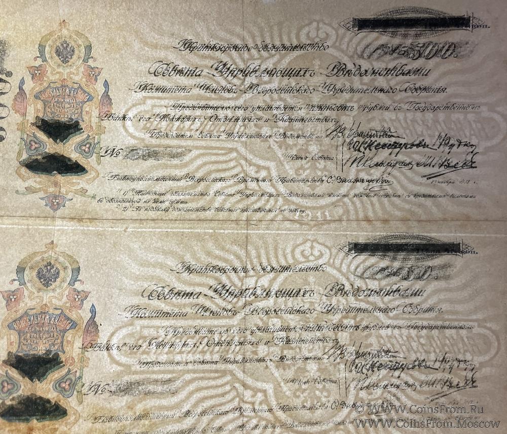 БРАК (ПРОБА) печати: двойная печать, сцепка из двух обязательств без фонового рисунка номиналом 50 рублей и 500 рублей. Цена вексельного бланка 45 копеек.