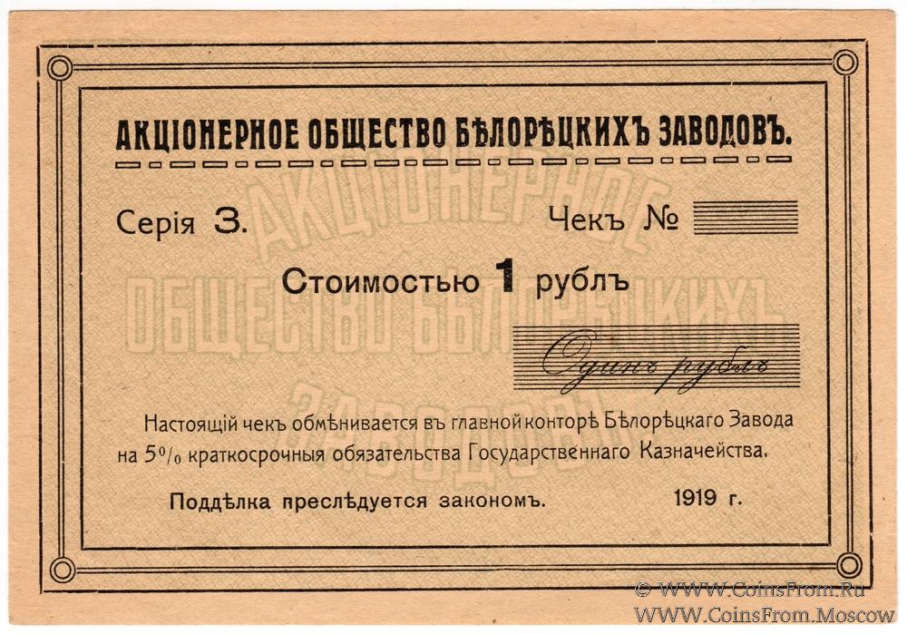 Чек 1919 г. Выпуск 1. Большой формат. Серия З. Акционерное Общество Белорецких Заводов.